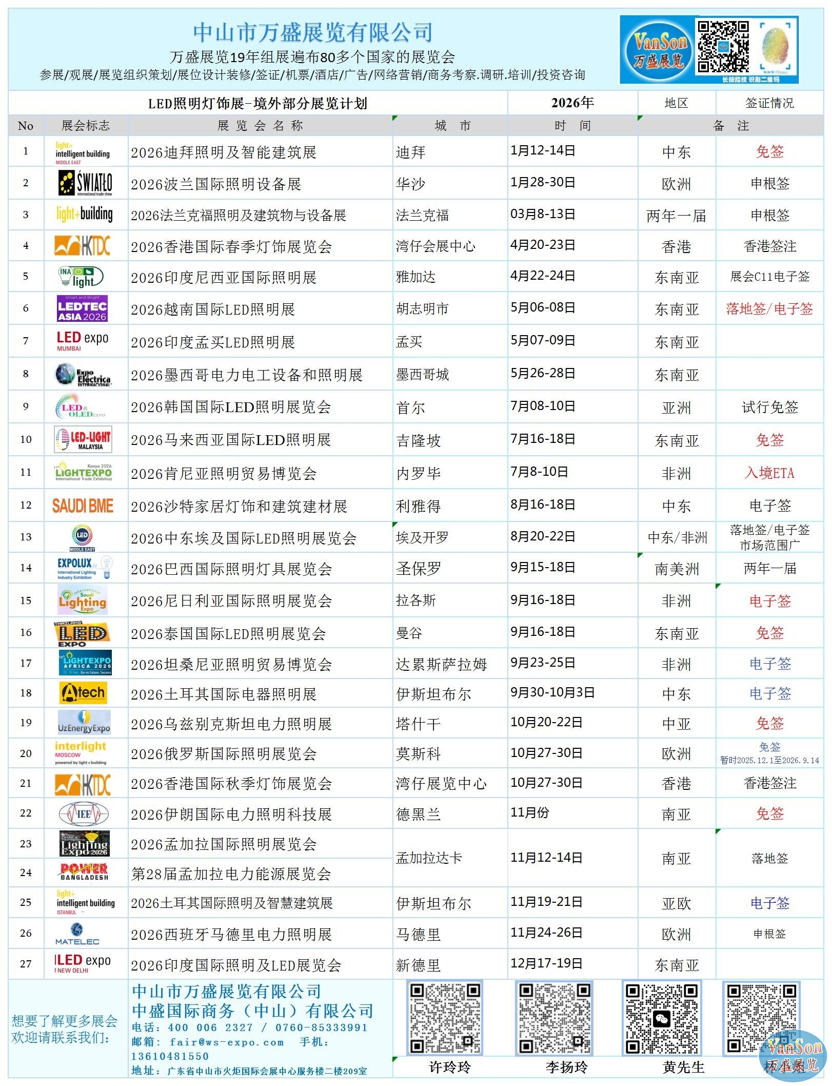 2026年全球LED照明灯饰展览会 境外部分展览计划表。万盛展览19年组展遍...